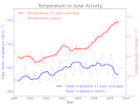 It's Not Solar Radiation:Many people attribute the warming that we have observed to an increase in solar radiation. This is a view that does not stand up to the slightest scrutiny. Click on the image at left and you see temperature in red and solar radiation in blue. Solar radiation has changed less that 0.1% in the last century, and the observed temperature has not been moving in sync with it. Furthermore, if warming were due to an increase in